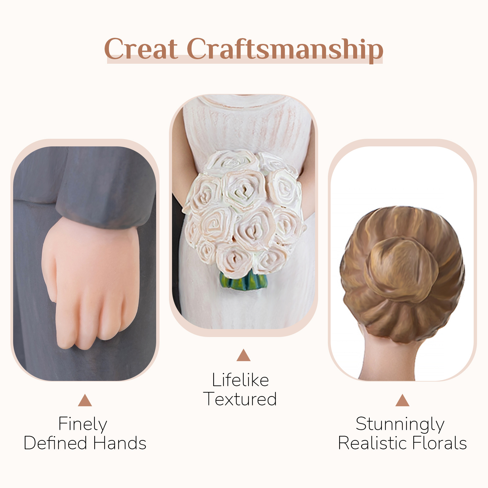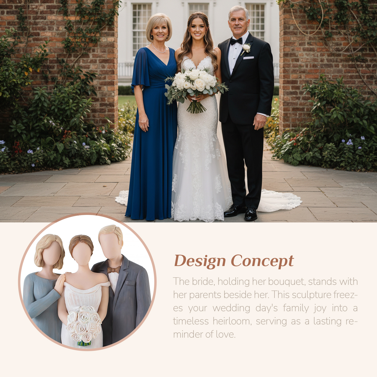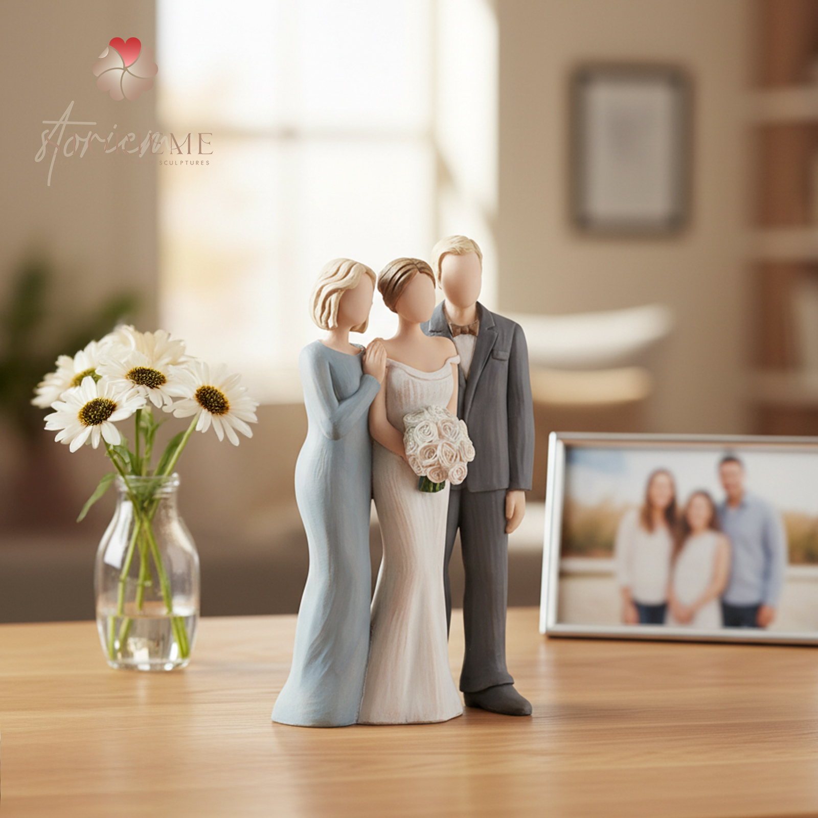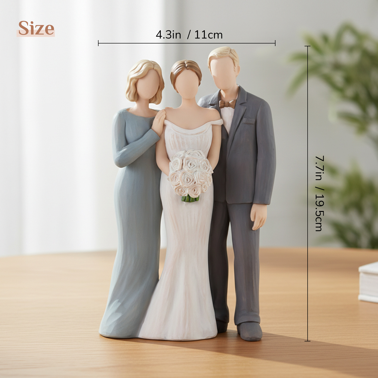 This bride with parents figurine captures that deeply meaningful scene: a daughter between the two people who have loved, supported, and shaped her every step of the way. It's a moment filled with pride, gratitude, and the kind of love that words often fall short of expressing.
