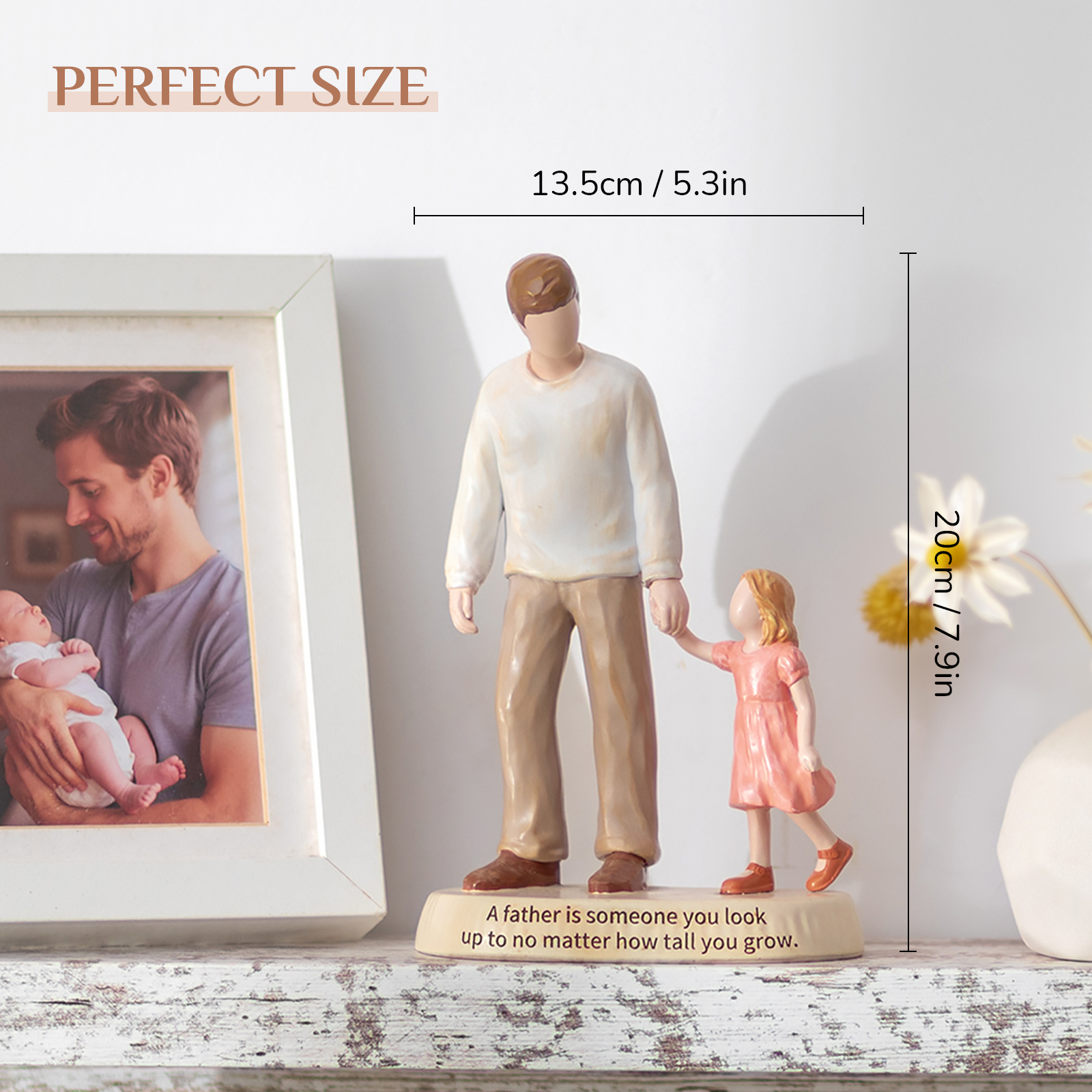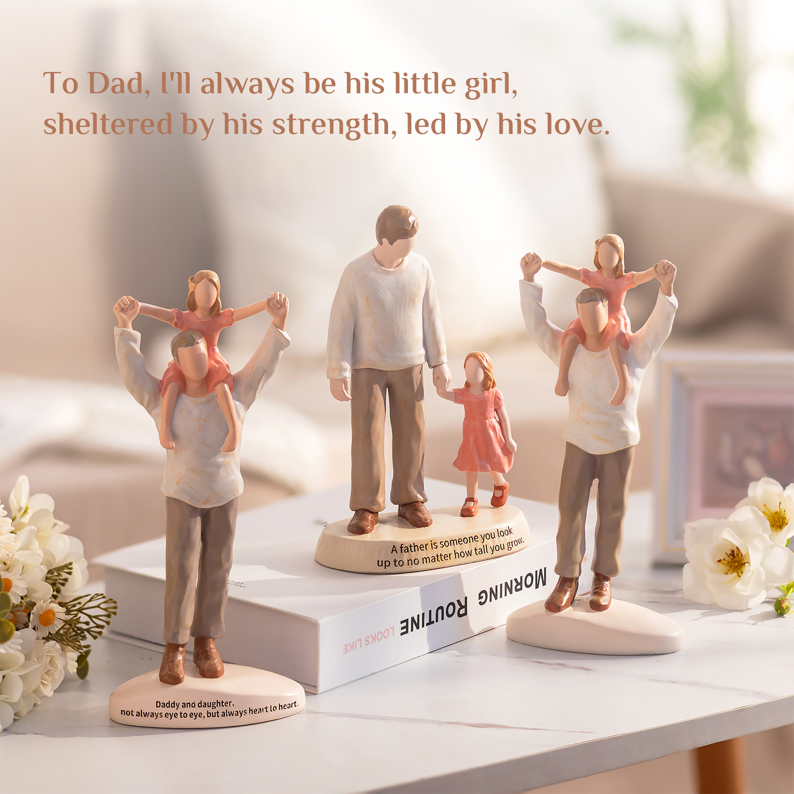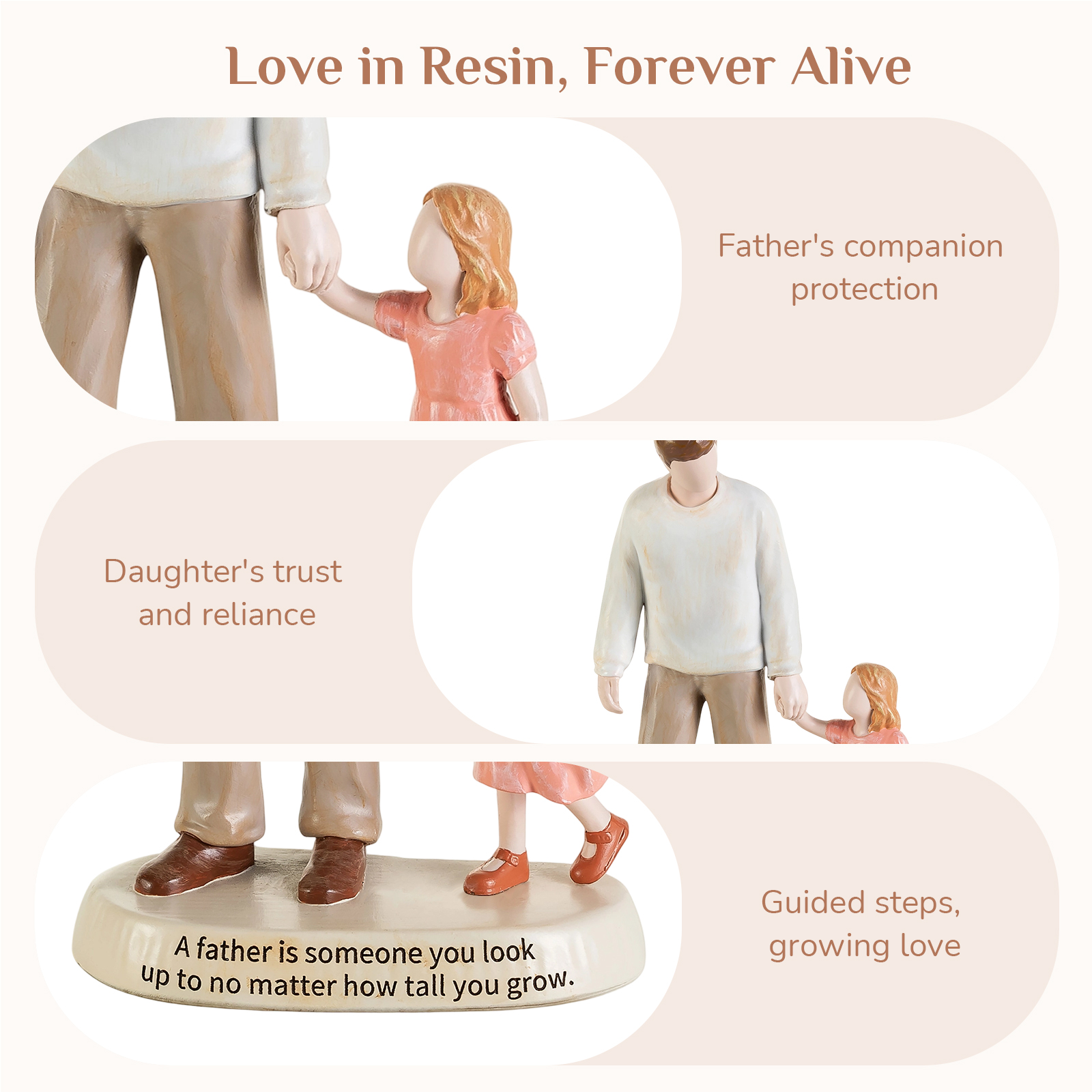 This father and daughter figurine captures a simple yet powerful moment — a little girl walking hand in hand with her dad. It reflects a bond built on guidance, protection, and quiet strength.