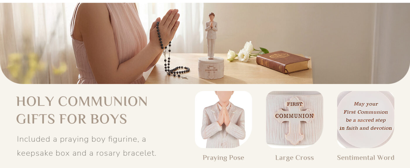 • Includes praying boy figurine, keepsake box, rosary with cross, and message card